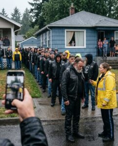 Two patrol cars rolled slowly down Linden Street, tires hissing against wet asphalt. Officers stepped out cautiously, scanning the line of bikers who stood shoulder to shoulder along the curb.
