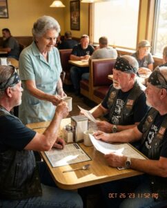 They ate slowly, joked softly, laughed without raising their voices. No beer spilled. No mess. No complaints. When one plate came out wrong, the biker simply said, “No worries, ma’am. Happens to the best of us.”