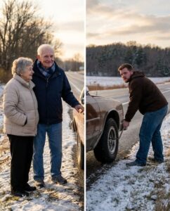 I almost didn’t pull over that day. Snow was falling hard, traffic was rushing past, and my seven-year-old daughter was happily singing in the back seat as we drove to my parents’ house for Thanksgiving. But when I saw an elderly couple standing beside a battered car with a completely flat tire, shivering in thin coats, something in me wouldn’t let me keep going. I told myself it would only take a few minutes. I had no idea that stopping on that frozen highway would quietly set off a chain of events that would reshape my entire life.
