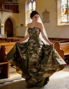 When the church doors opened, my fiancée wasn’t wearing white — she was in a wedding dress made from army shirts. The room went silent. Then she stopped halfway down the aisle, looked at me, and said something that made me think the wedding was over.