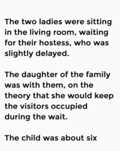 The two ladies were sitting in the living room, waiting for their hostess, who was slightly delayed. The daughter of the family was with them, on the theory that she would keep the visitors occupied during the wait. The child was about six years old, snub nosed, freckled, buck-toothed and bespectacled.