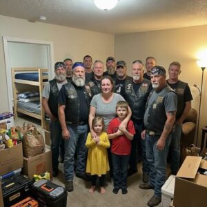What happened next still feels unreal. One biker offered me a job with benefits starting immediately. Others fixed broken things around the apartment, filled our kitchen with groceries, repaired my car, and made sure my children were enrolled in after-school care. They listened as I told them about my husband, about the life we planned and the future that vanished overnight. My son climbed onto Marcus’s lap and proudly said his father was a hero. Marcus agreed and told him that bravery runs in families. Before they left, my son tried to give Marcus his father’s dog tags. Marcus refused, instead pinning a small club badge on my son’s shirt and calling him an honorary member. Six months later, those bikers are still in our lives. They didn’t just stop an eviction. They showed my children that their father’s sacrifice mattered, and they reminded me that even in the darkest moments, family can appear where you least expect it.